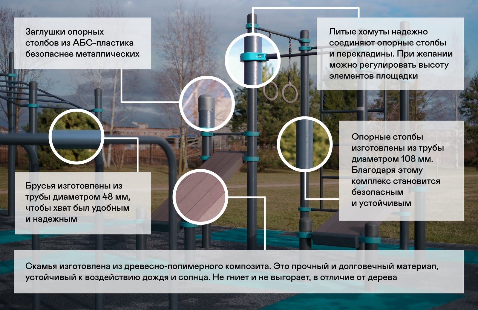 Площадки Kenguru Pro преображают внешний вид двора загородного дома, многоэтажки, элитного фитнес-клуба. Вы можете сами выбрать цвет столбов и хомутов, чтобы оборудование выделялось на фоне остальной инфраструктуры.