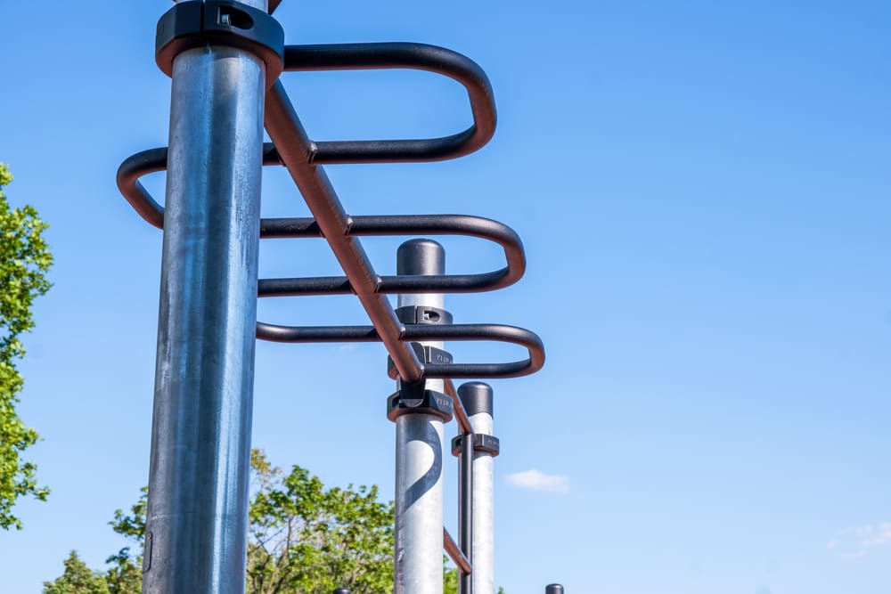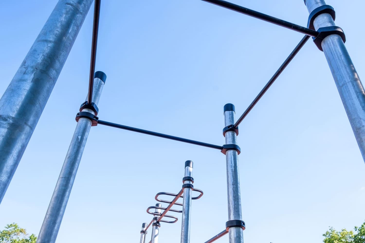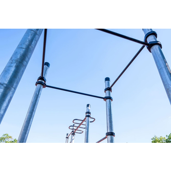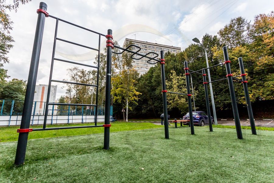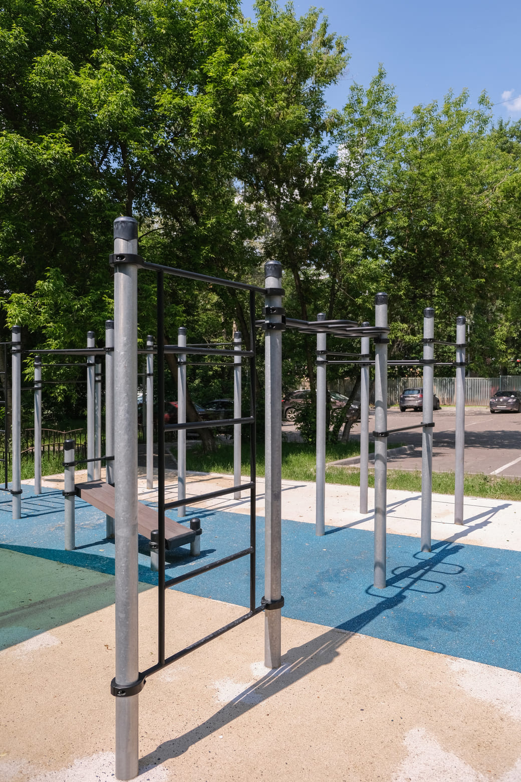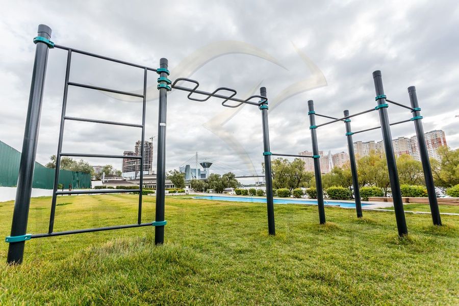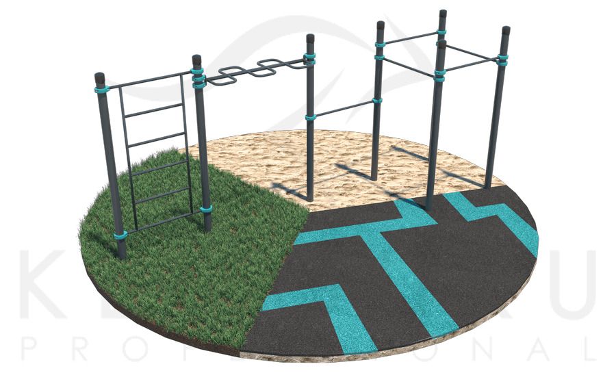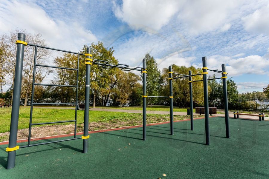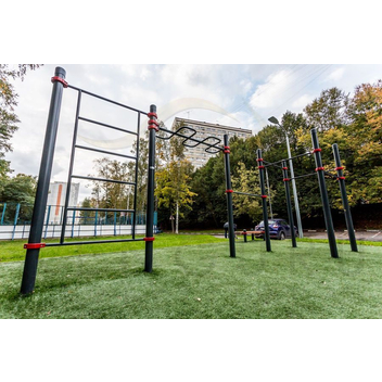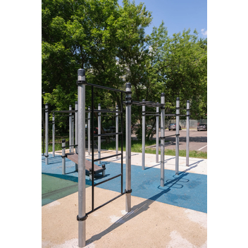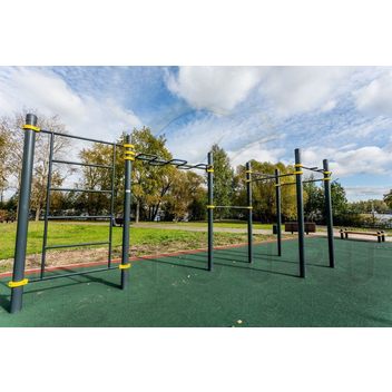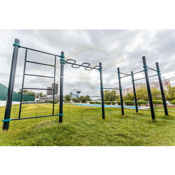 Комплекс состоит из семи опорных столбов высотой 2600 мм, пяти перекладин для подтягиваний длиной 1200 мм, рукохода-змеевика и шведской стенки.