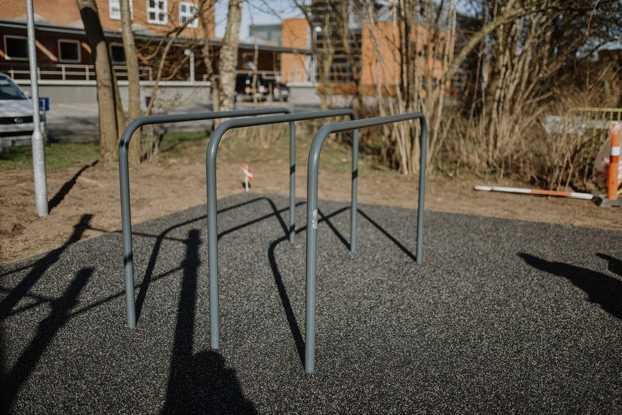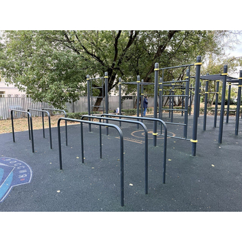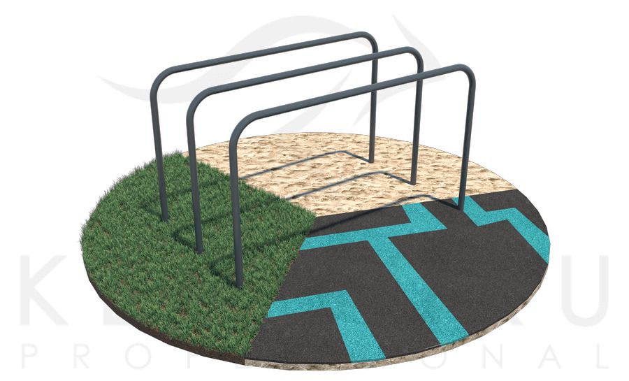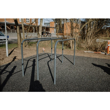 В обычные гнутые брусья мы добавили одну жердь. Благодаря этому на снаряде могут заниматься больше пользователей. При этом занимаемая площадь увеличивается незначительно. Кроме того на двойных гнутых брусьях можно выполнять больше упражнений, чем на обычных.