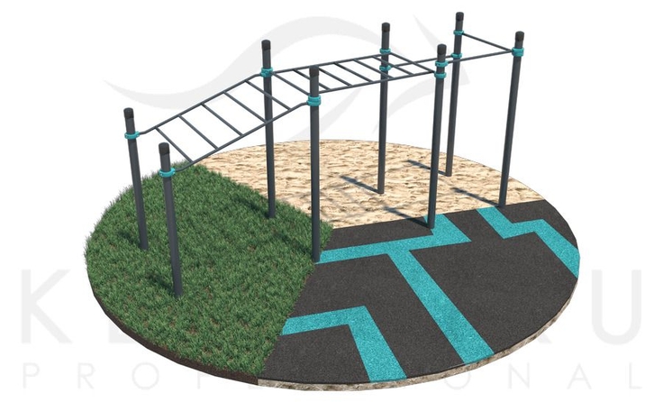 Комплекс состоит из восьми опорных столбов высотой: 6 шт. - 2600 мм, 2 шт. – 2000 мм, трех перекладин для подтягиваний длиной 1200 мм, одного рукохода и одного рукохода в подъем. Элементы крепятся к опорным столбам при помощи хомутов. Высота фиксации перекладин для подтягиваний: 1 шт. – 2300 мм, 1 шт. – 2100 мм, 1 шт. – 1800 мм. Высота фиксации секции рукохода: 2100 мм, длина секции 1900 мм, шаг рукохода 310 мм. У рукохода в подъём конечные части изогнуты под углом 30 градусов, высота подъема 500 мм, длина подъёма 1770 мм. Шаг перекладин рукохода 350 мм. Высота подъема от 1500 мм до 1966 мм (от поверхности основания). Длина комплекса не более 5200 мм