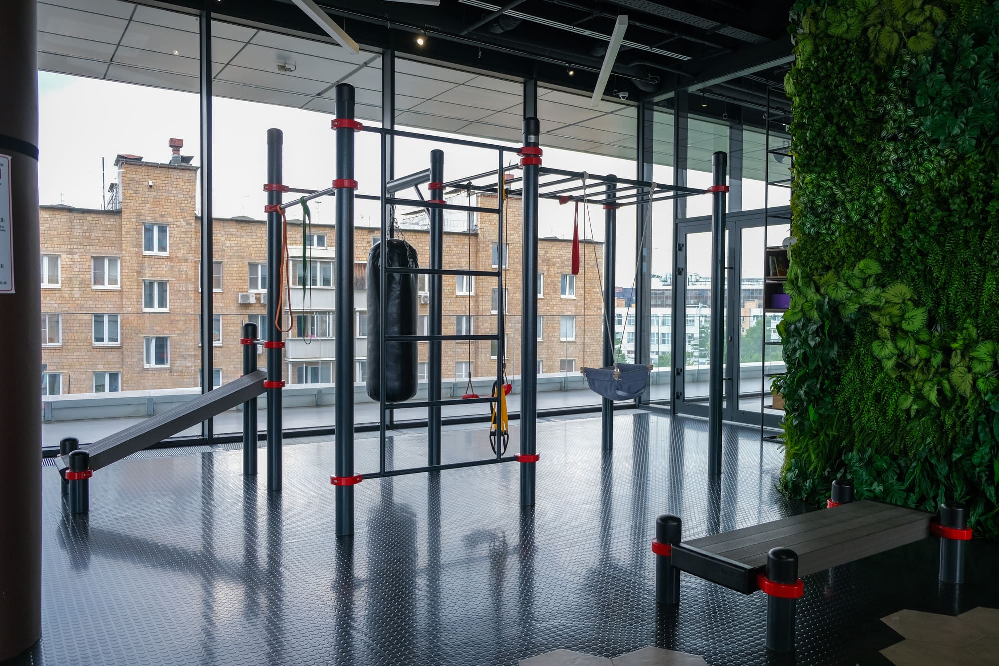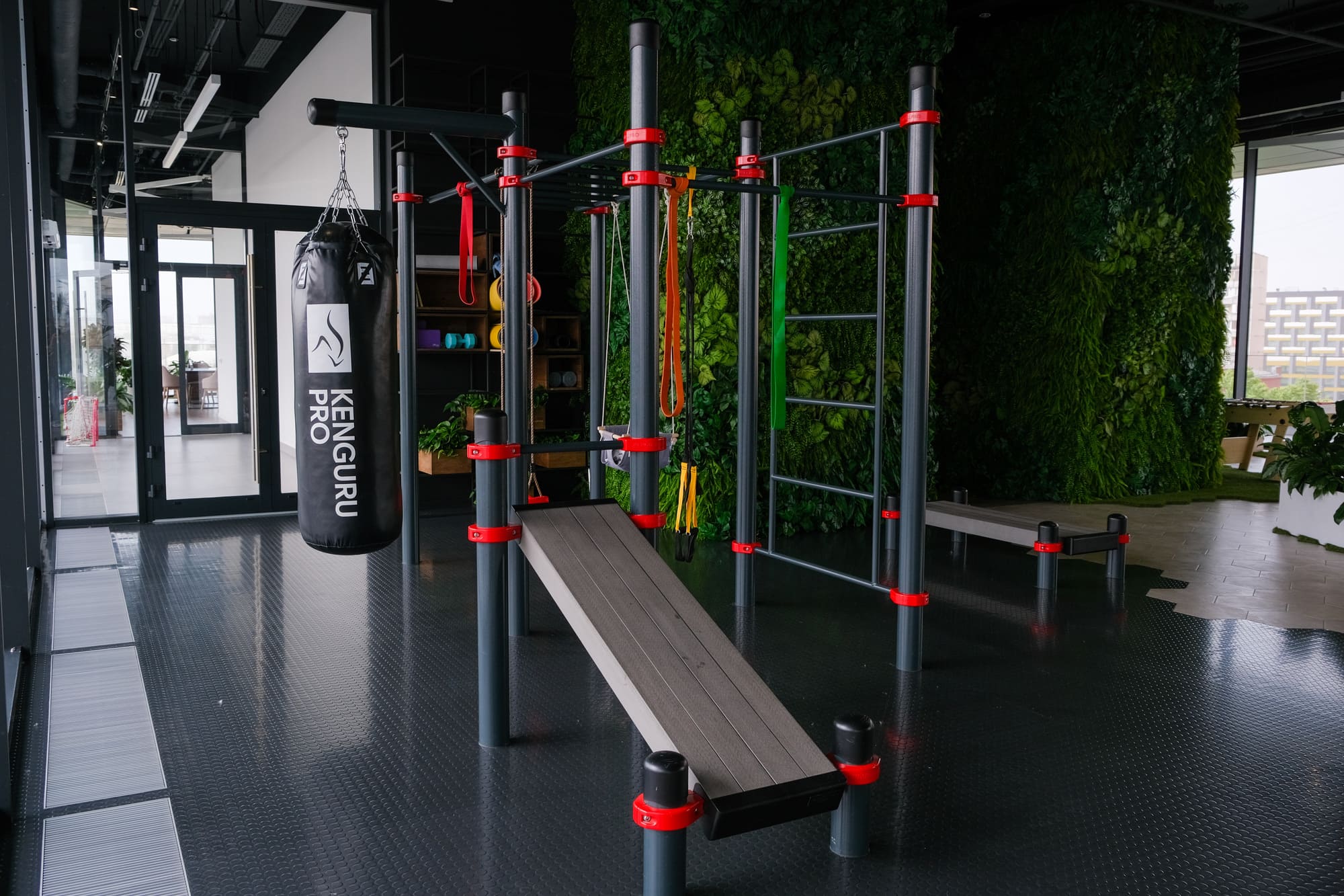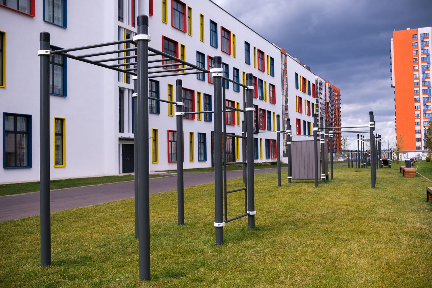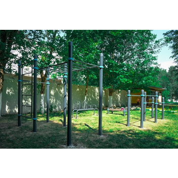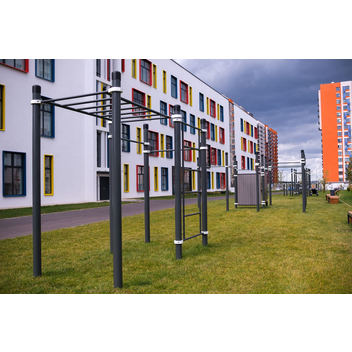 Компактный спортивный комплекс для воркаута рассчитан на 3–4 человек и подходит для всех упражнений с собственным весом: рукоход развивает грудную клетку и координацию, на шведской стенке можно качать пресс и делать растяжку, на турниках можно работать с мышцами спины, плечевого пояса и рук. У снарядов удобный хват, шаг и высота. Зимой с перекладин не соскальзывают руки, а соединение «хомут» позволяет выдерживать 9-кратные нагрузки. За качество тренажеры получили сертификат TUV и рекомендованы к эксплуатации на чемпионатах.