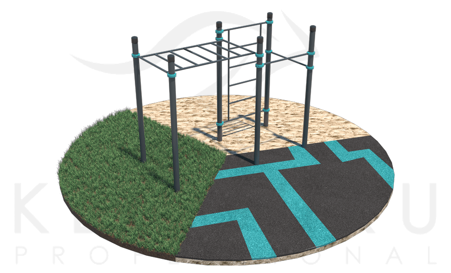 Комплекс состоит из шести опорных столбов высотой 2600 мм, рукохода, шведской стенки и двух перекладин для подтягиваний длиной 1200 мм. Элементы крепятся к опорным столбам при помощи хомутов. Высота фиксации перекладин для подтягиваний: 1 шт. - 1800 мм, 1 шт. - 2100 мм. Шведская стенка крепится на высоте 2450 мм. Состоит из перекладин, расстояние между которыми 373 мм. Высота шведской стенки - 2100 мм, ширина - 1200 мм. Высота фиксации секции рукохода: 2300 мм, длина секции 1900 мм, шаг рукохода 310 мм. Длина комплекса не более 3300 мм.