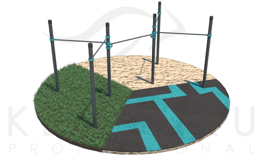 Комплекс состоит из шести опорных столбов высотой 2600 мм, и пяти перекладин для подтягиваний длиной 1800 мм, которые крепятся к опорным столбам при помощи хомутов на высоте 2 шт. - 2200 мм, 2 шт. - 2000 мм, 1 шт. - 1900 мм. Длина комплекса не более 4700 мм.