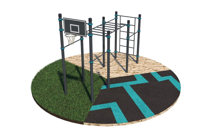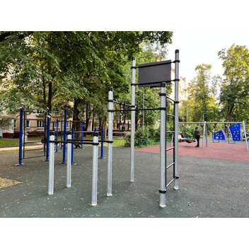 Воркаут-комплекс Хатанга баскет подойдет для общественных пространств. На нем вы сможете прокачать мышцы спины, рук, брюшного пресса. К стандартным воркаут элементам: турникам и шведской стенке мы добавили баскетбольный щит. Поэтому любители баскетбола смогут покидать мяч в кольцо. Все элементы крепятся к опорным столбам с помощью надежных хомутов, которые выполнены из сплава алюминия и кремния. Благодаря такой конструкции снаряды выдерживают нагрузку в девять раз превышающую вес человека.