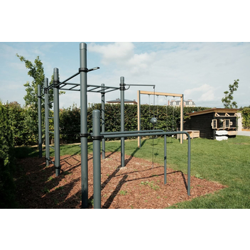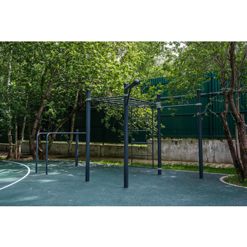 Спортивный комплекс для занятий всей семьей. На турниках разной высоты вы сможете заниматься с ребенком, показывая, как правильно выполнять упражнения.