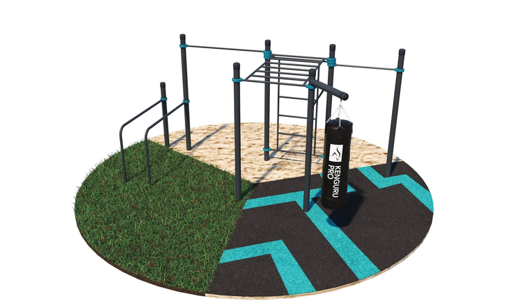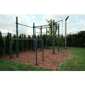 Комплекс подходит для установки на территории частного дома. Шведская стенка вместе с рукоходом — отличный комплекс для укрепления мышц рук, а также место, где ребенок может расходовать лишнюю энергию. Качайте пресс или отжимайтесь на гнутых брусьях. На боксерском мешке оттачивайте навыки единоборств, используя удары не только руками, но и ногами.
