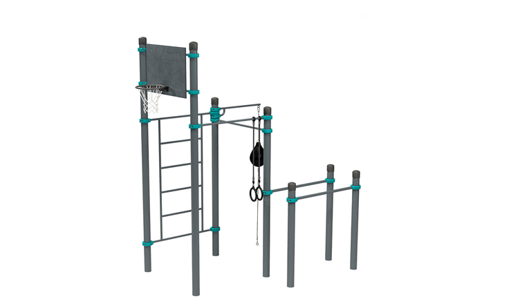 2 турника, баскетбольный щит, брусья, кольца, скалодром, шведская стенка