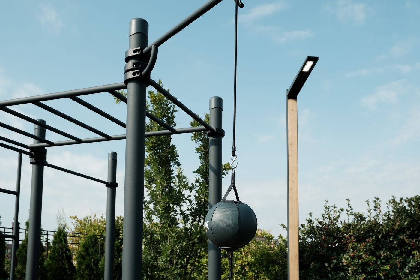 На турниках можно подтягиваться, делать выход силой и подъём ног к перекладине, а на брусьях отжиматься и тренировать баланс. Кольца подойдут для подтягиваний, кувырков и вертикальных стоек. Такие упражнения укрепляют вестибулярный аппарат. Еще есть груша: на ней можно отработать технику ударов или просто выпустить пар после тяжелого дня.