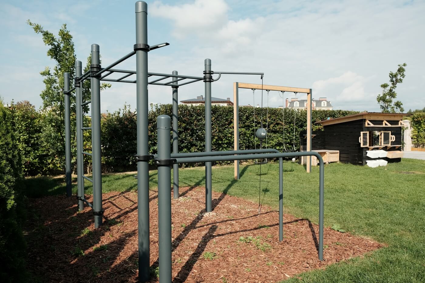 Комплекс можно установить во дворе частного дома. Наши монтажники сами подготовят поверхность, быстро поставят оборудование и уберут строительный мусор. Если нужно резиновое покрытие, уложат его после установки комплекса.