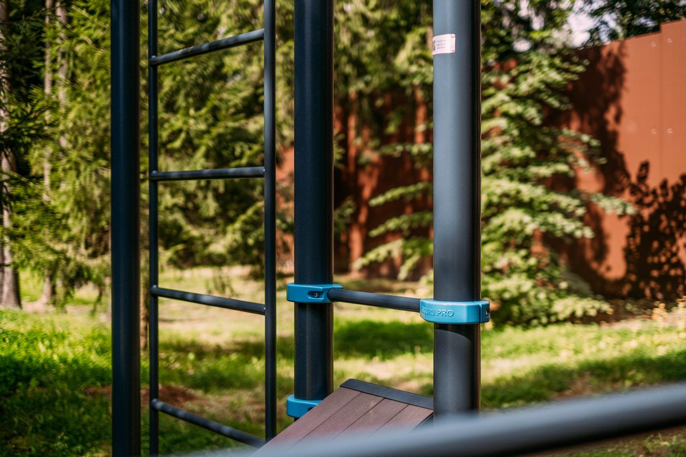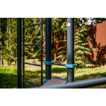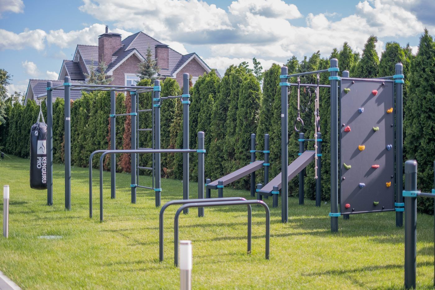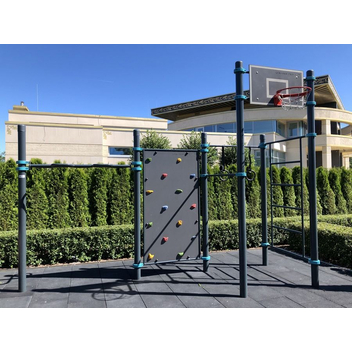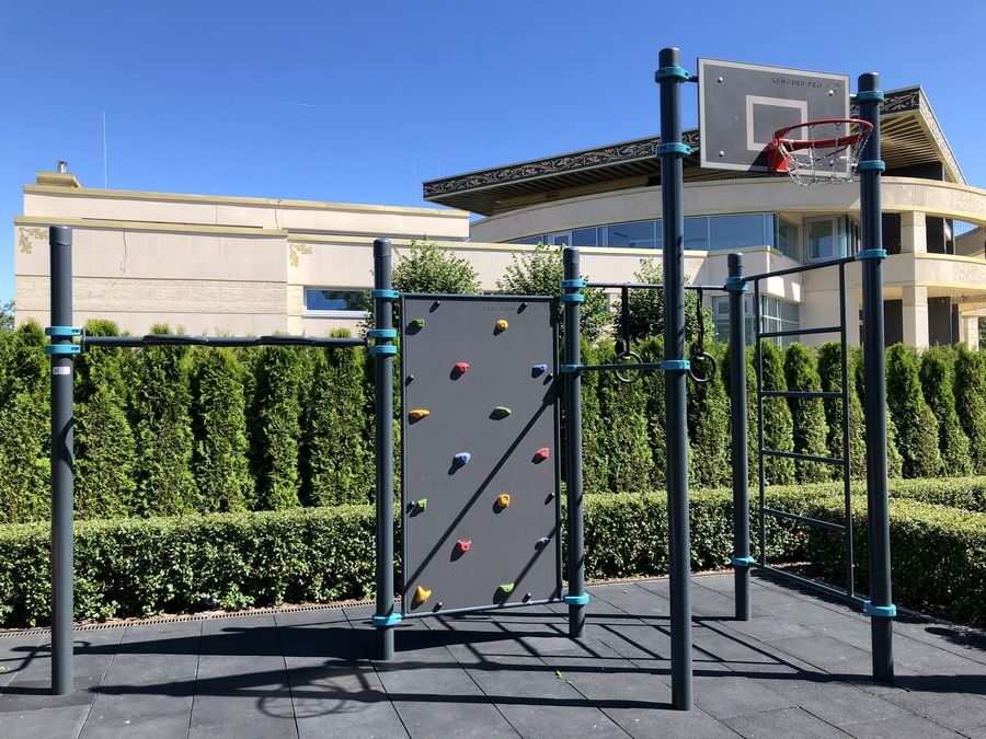 Спортивная площадка, на которой могут заниматься сразу несколько человек. Кто-то будет делать продвинутые упражнения для пресса на скамье, кто-то займется тренировкой на кольцах, а дети будут увлечены скалодромом. И еще останется место любителям растяжки.
