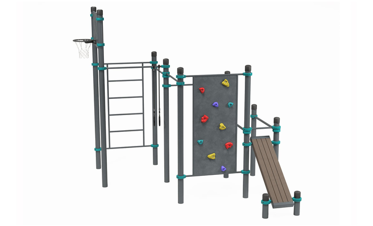 4 турника, баскетбольный щит, брусья, кольца, наклонная скамья, скалодром, шведская стенка