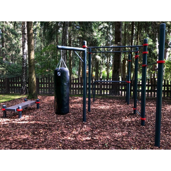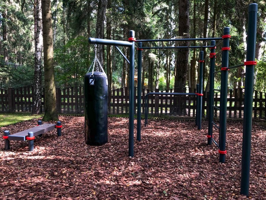 - здесь есть всё самое необходимое для тренировки: разноуровневые турники, шведская стенка, брусья, боксёрский мешок,