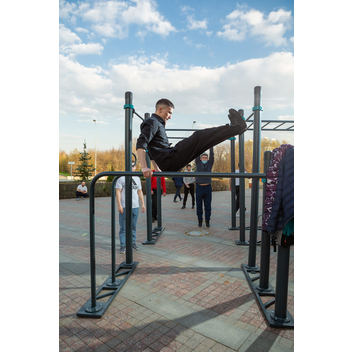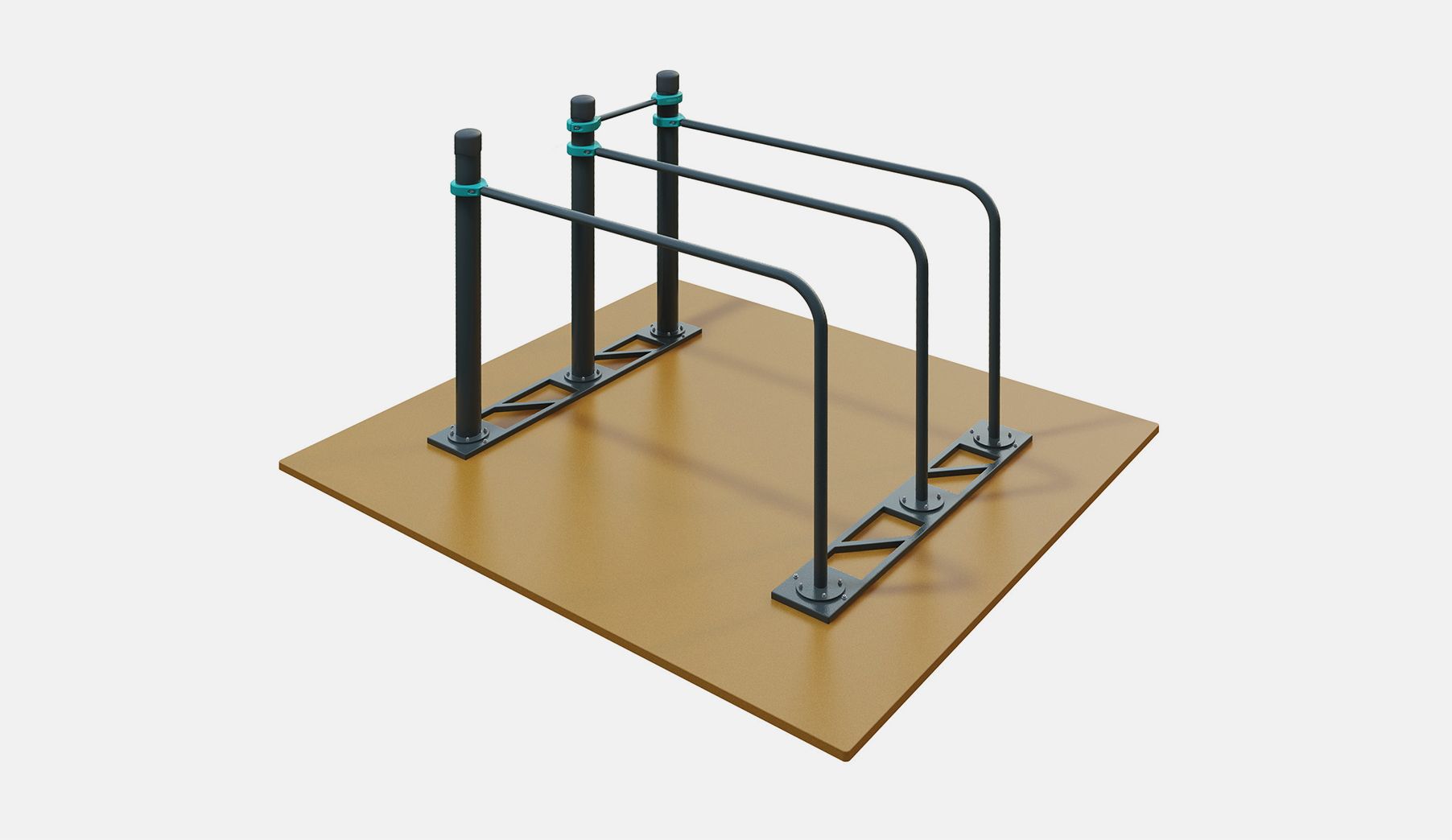 У гнутых брусьев D-001 три жерди. Диаметр жердей 48 мм — не режут ладони. С одной стороны жерди крепятся при помощи хомутов к опорным столбам диаметром 108 мм. С другой стороны через фланец при помощи болтов — к металлическим основаниям. На каждый столб устанавливается безопасная и стильная заглушка из АБС пластика.