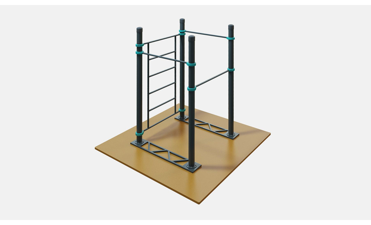 Три турника воркаут комплекса D-002 устанавливаются на разной высоте, чтобы каждый занимающийся мог найти подходящую под свой рост высоту. Диаметр турников 34 мм. Как показывает наш опыт это оптимальный для большинства занимающихся диаметр турника — не режет руку, хват удобный и крепкий. Длина турников — 1200 мм. Шведская стенка длиной 2007 мм крепится на высоте 2450 мм. Турники и шведская стенка крепятся к опорным столбам воркаут комплекса при помощи хомутов.