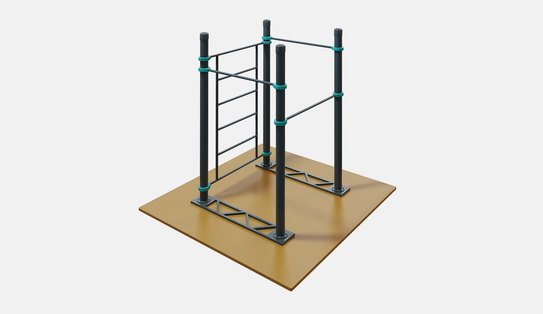 У гнутых брусьев D-002 три жерди. Диаметр жердей 48 мм — не режут ладони. С одной стороны жерди крепятся при помощи хомутов к опорным столбам диаметром 108 мм. С другой стороны через фланец при помощи болтов — к металлическим основаниям. На каждый столб устанавливается безопасная и стильная заглушка из АБС пластика.