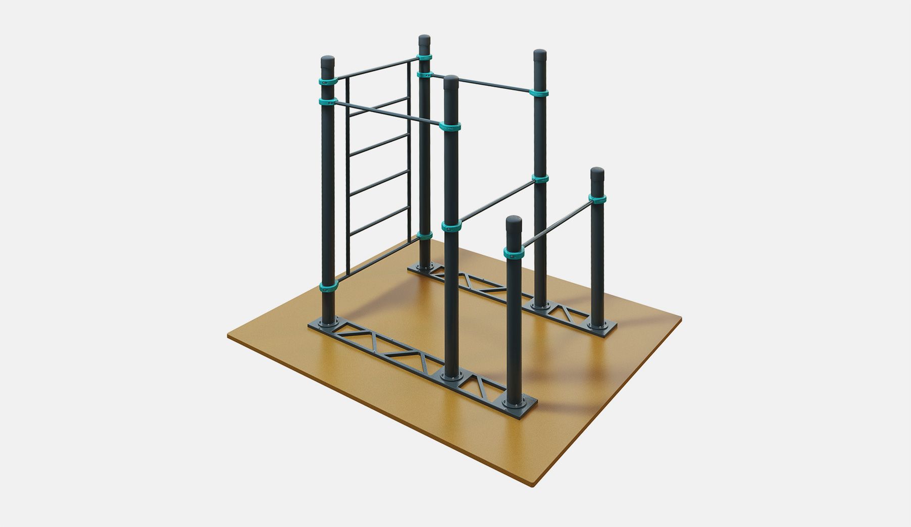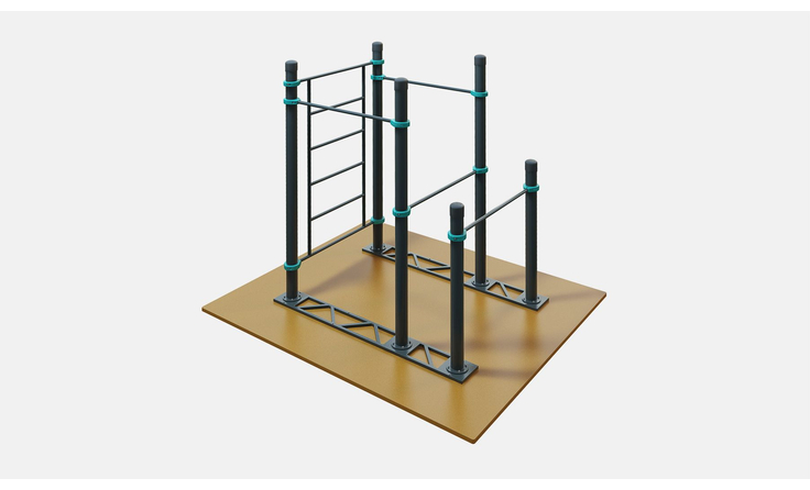 Два турника комплекса D-003 устанавливаются на разной высоте, чтобы был выбор у занимающихся разного роста. Диаметр турников 34 мм — хват удобный и крепкий. Длина турников — 1200 мм. Шведская стенка длиной 2007 мм крепится на высоте 2450 мм. Диаметр жердей брусьев 48 мм — не режет ладони при отжиманиях, хват удобный. Все элементы крепятся к опорным столбам мобильного воркаут комплекса при помощи хомутов.