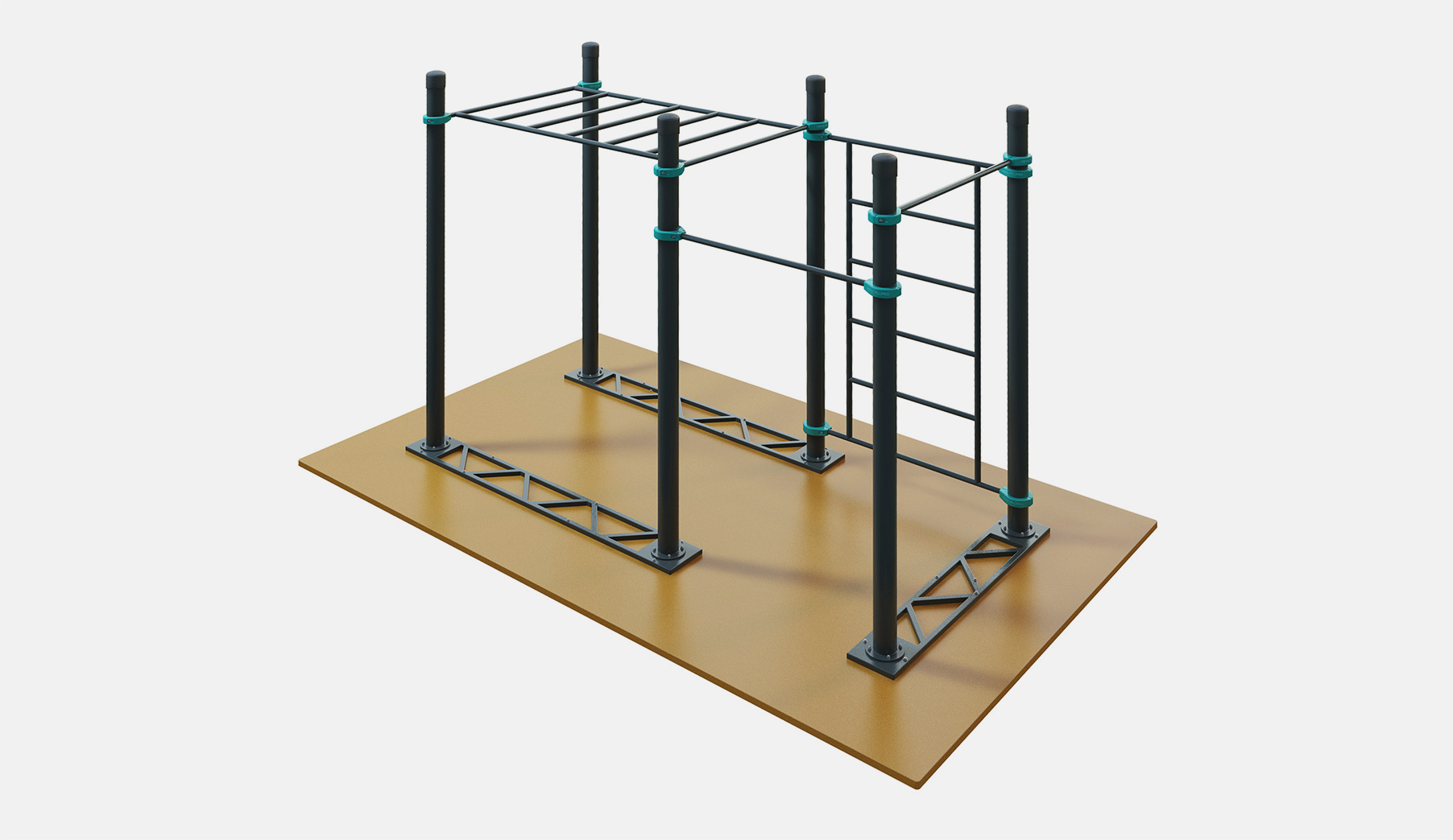 Комплекс устанавливается на специальных металлических основаниях, поэтому его можно ставить прямо на пол. Пол должен быть ровным и твёрдым. Например, асфальт, бетон или тротуарная плитка. Нельзя устанавливать воркаут комплекс на газон или песок.