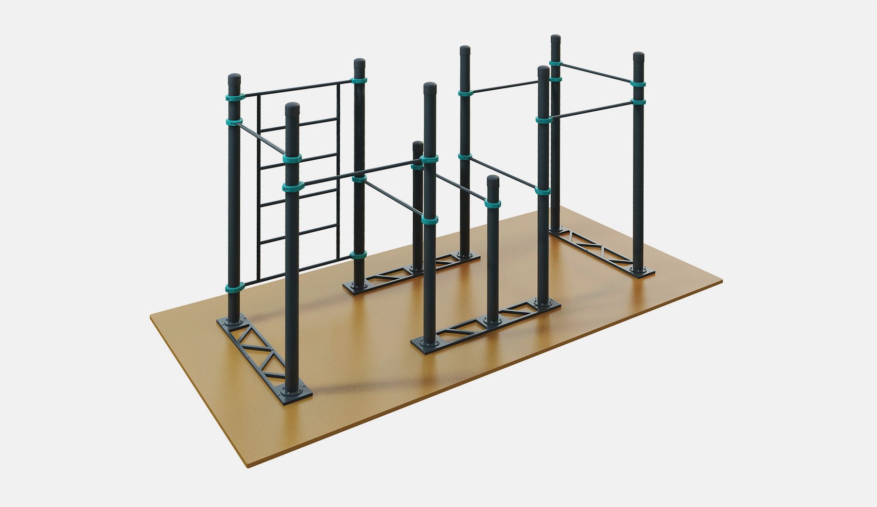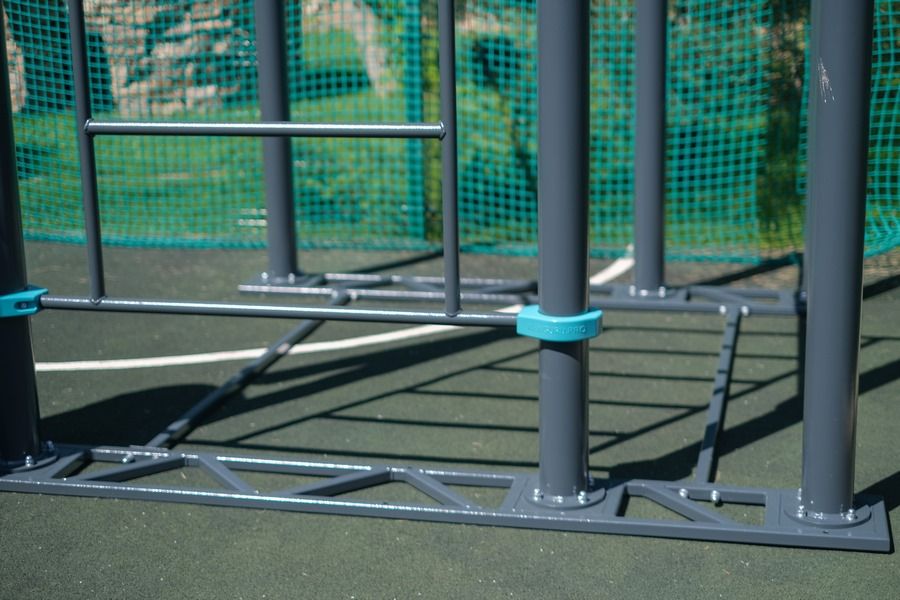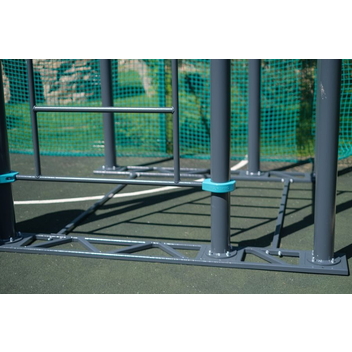 Комплекс устанавливается на специальных металлических основаниях, поэтому его можно ставить прямо на пол. Пол должен быть ровным и твёрдым. Например, асфальт, бетон или тротуарная плитка. Нельзя устанавливать воркаут комплекс на газон или песок.