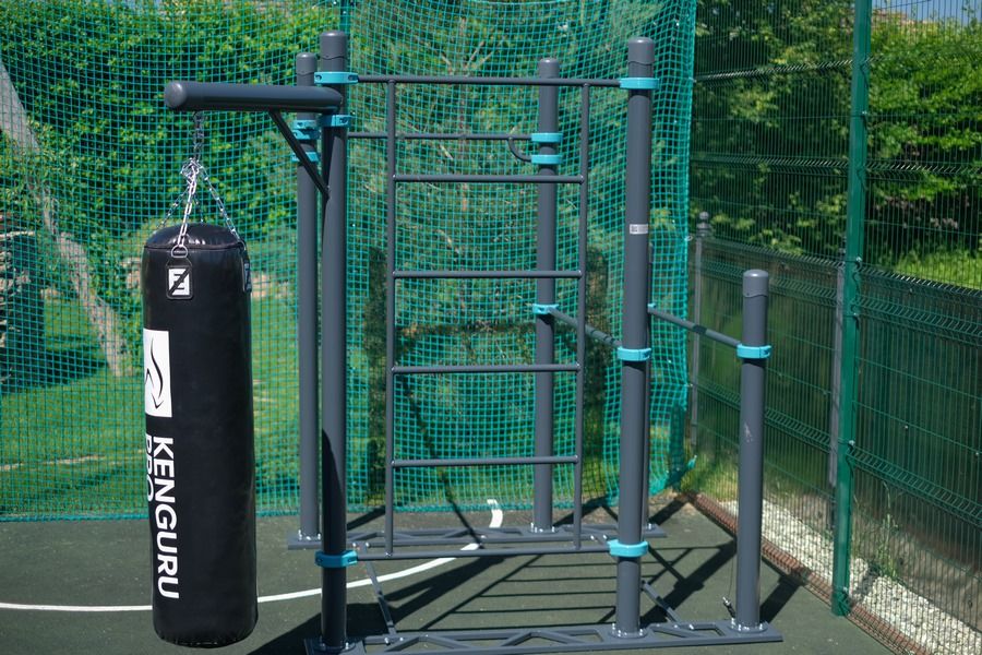 Пять турников устанавливаются на разной высоте, чтобы каждый пользователь мог найти подходящую высоту. Диаметр турников 34 мм — хват удобный и крепкий. Три турника длиной 1200 мм, два турника — 1758 мм. Шведская стенка длиной 2007 мм крепится на высоте 2450 мм. Гнутые брусья — двойные. Одновременно могут отжиматься несколько человек. Диаметр жердей брусьев 48 мм — не режет ладони при отжиманиях, хват удобный. Все элементы крепятся к опорным столбам мобильного воркаут комплекса при помощи хомутов.