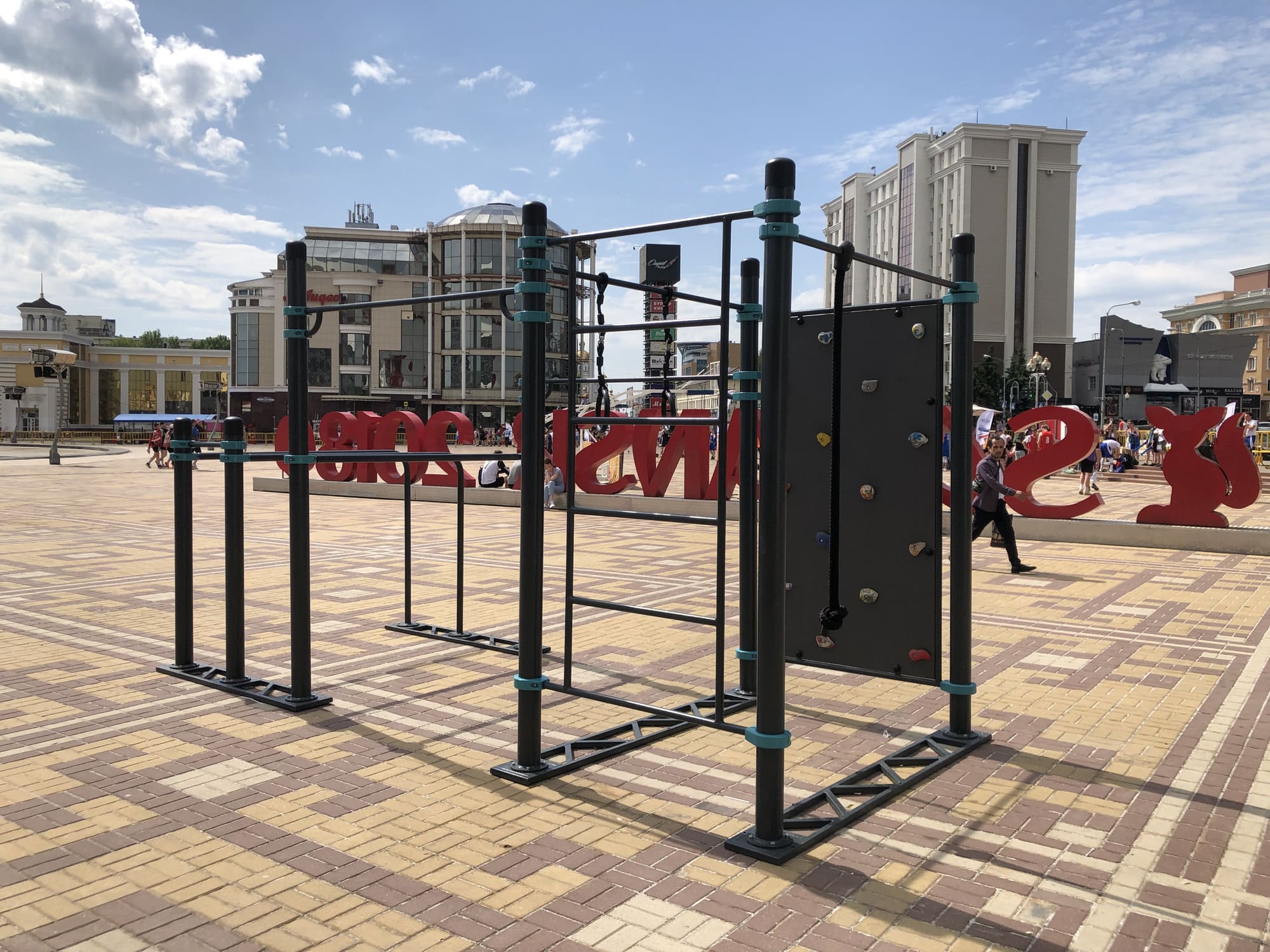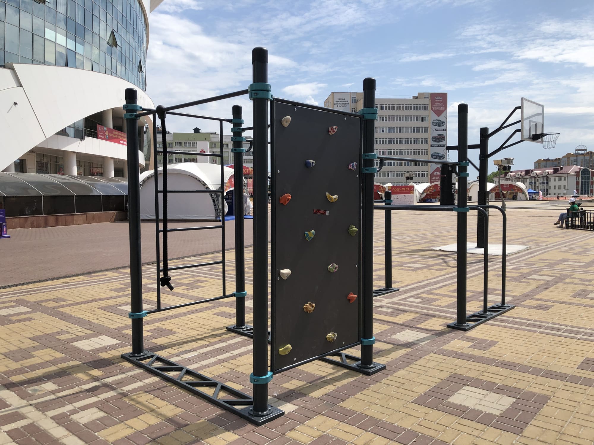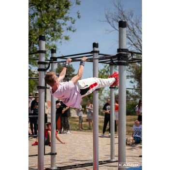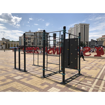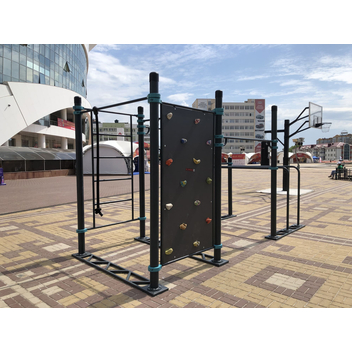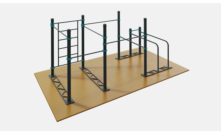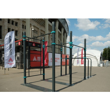 Пять турников устанавливаются на разной высоте — каждый желающий может найти подходящую высоту. Диаметр турников 34 мм — хват удобный и крепкий. Длина трёх турников — 1200 мм, двух — 1758 мм. Шведская стенка длиной 2007 мм крепится на высоте 2450 мм. Диаметр жердей брусьев 48 мм — не режет ладони при отжиманиях, хват удобный. Все элементы крепятся к опорным столбам мобильного комплекса при помощи хомутов.