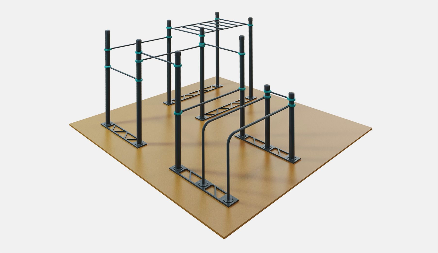 Для большей устойчивости рекомендуется прикрепить основания воркаут комплекса к полу при помощи анкеров. Если непосредственно к полу крепить оборудование нельзя, то можно изготовить деревянный помост для установки на него воркаут комплекса. Каркас этого помоста можно изготовить из деревянных брусков и обшить каркас фанерой. Сверху устанавливаем комплекс, металлические основания прикрепляем к помосту.