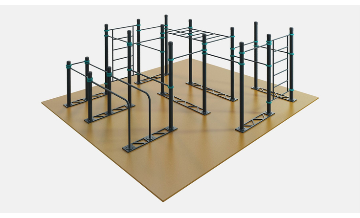 Восемь турников устанавливаются на разной высоте — каждый желающий может найти подходящую и все они смогут заниматься одновременно. Диаметр турников 34 мм — хват удобный и крепкий. Длина турников — 1200 мм. Две шведская стенка длиной 2007 мм крепятся на высоте 2450 мм. Диаметр жердей гнутых брусьев 48 мм — не режет ладони при отжиманиях, хват удобный. Длина рукохода 1900 мм. Все элементы крепятся к опорным столбам мобильного комплекса при помощи хомутов.