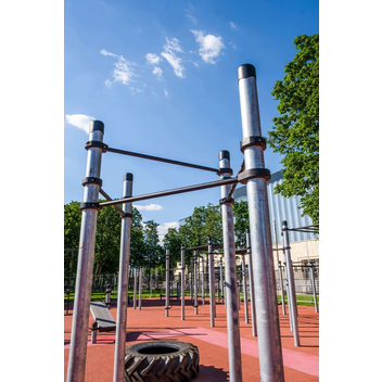 Воркаут-комплекс из 3 турников на опорных столбах диаметром 108 мм подходит для занятий летом и зимой, так как не подвержен обледенению, с него не соскальзывают руки. Перекладины прочно закреплены соединением «хомут» и выдерживают 9-кратные нагрузки.