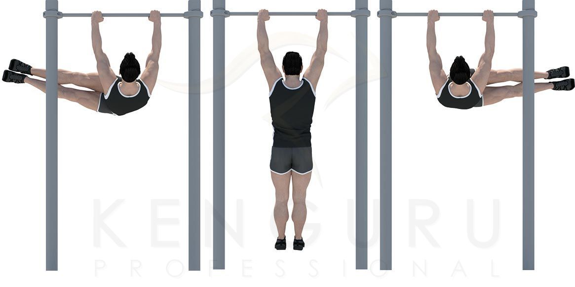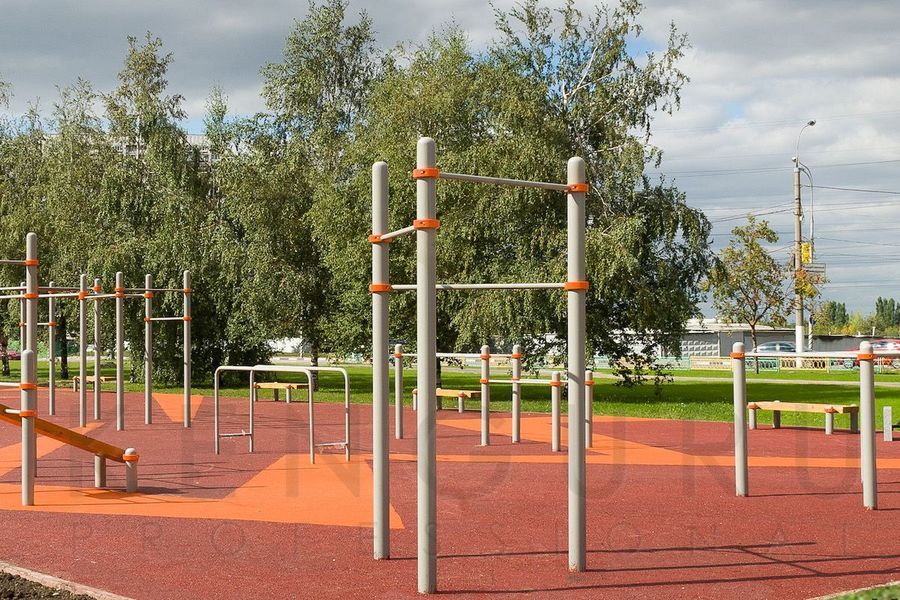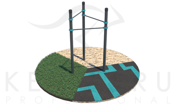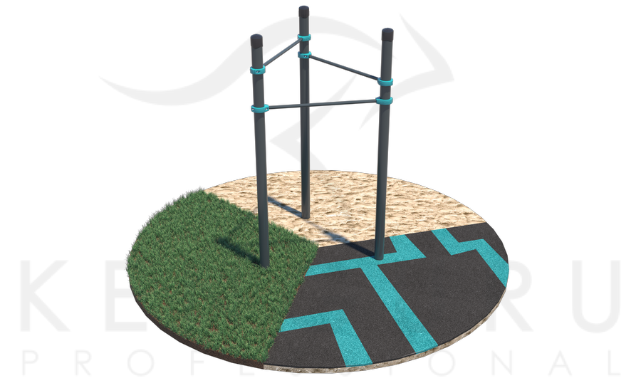 Комплекс состоит из трех опорных столбов высотой 2600 мм и трех перекладин для подтягиваний длиной 1200 мм, которые крепятся к опорным столбам при помощи хомутов на высоте: 1 шт. – 2300 мм, 1 шт. – 2100 мм, 1 шт. – 1900 мм. Длина комплекса не более 1450 мм.
