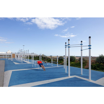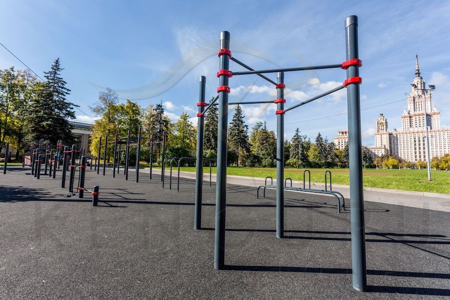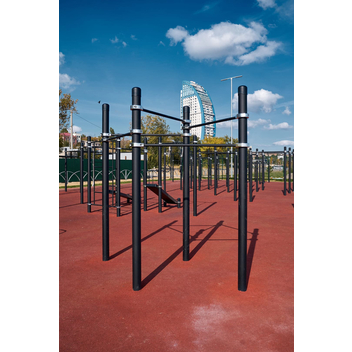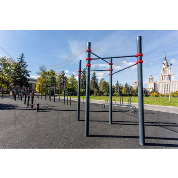 Воркаут-комплекс из 5 турников на опорных столбах диаметром 108 мм рассчитан на 3–5 занимающихся. На нем можно выполнять подтягивания, качать пресс, делать подъем ног, но основным преимуществом этой модели является компактность: на небольшой площади размещены сразу 5 турников.