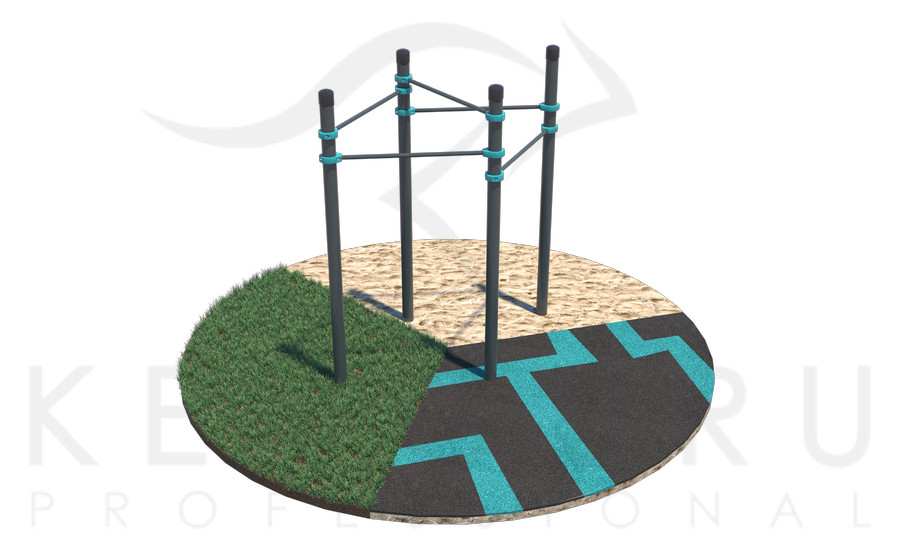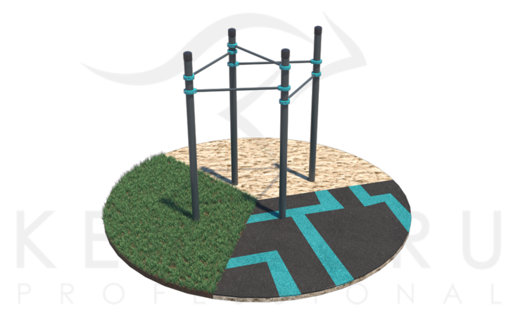 Комплекс состоит из четырёх опорных столбов высотой 2600 мм и пяти перекладин для подтягиваний длиной 1200 мм, которые крепятся к опорным столбам при помощи хомутов на высоте: 1 шт. – 2400мм, 1 шт. – 2300мм, 2 шт. – 2100мм, 1 шт. – 1900мм. Длина комплекса не более 2400 мм.