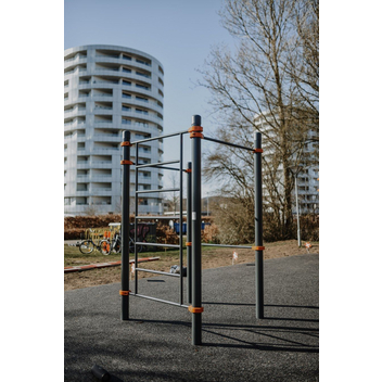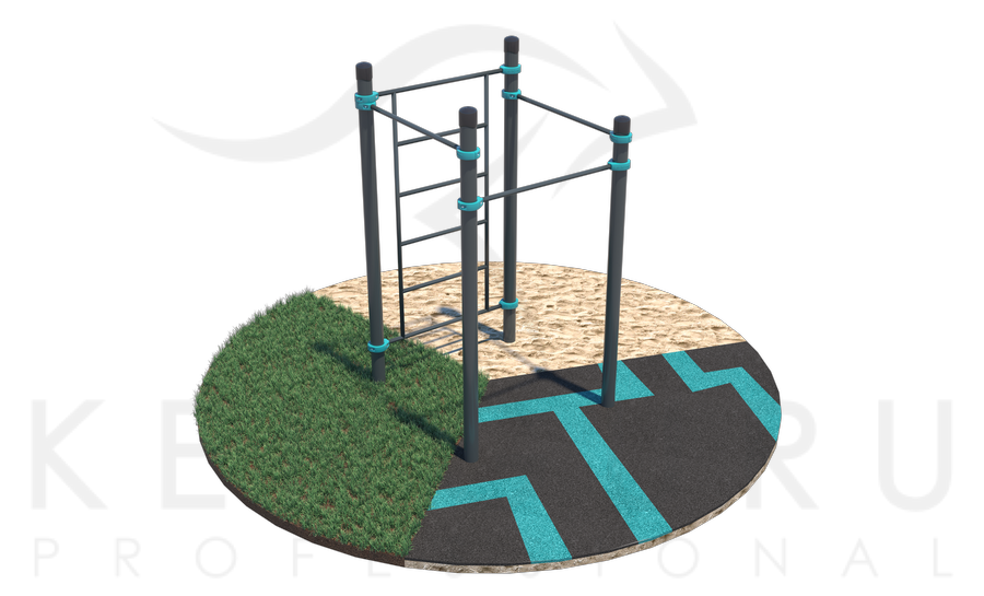 Комплекс состоит из четырех опорных столбов высотой: 3 шт. – 2600 мм, 1 шт. - 2300 мм, шведской стенки и трех перекладин для подтягиваний. Элементы крепятся к опорным столбам при помощи хомутов. Шведская стенка крепится на высоте 2450 мм. Состоит из перекладин, расстояние между которыми 370 мм. Высота шведской стенки - 2000 мм, ширина - 1200 мм. Высота фиксации перекладин для подтягиваний: 1 шт. – 2300 мм, 1 шт. – 2100 мм, 1 шт. – 2000 мм. Длина комплекса не более 1450 мм.