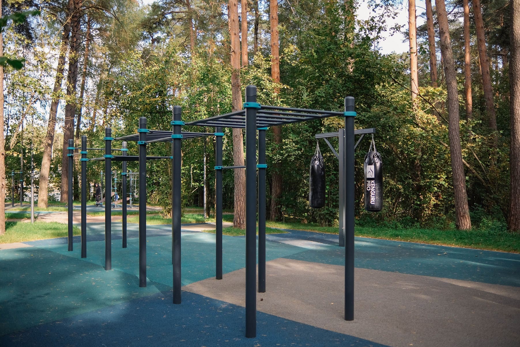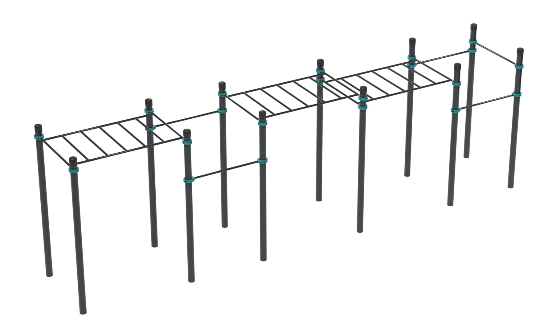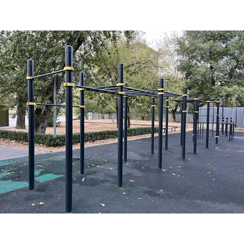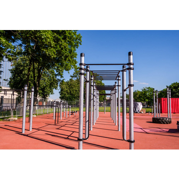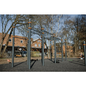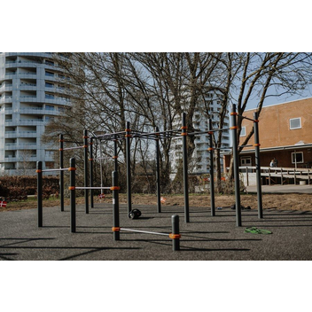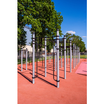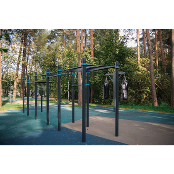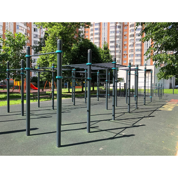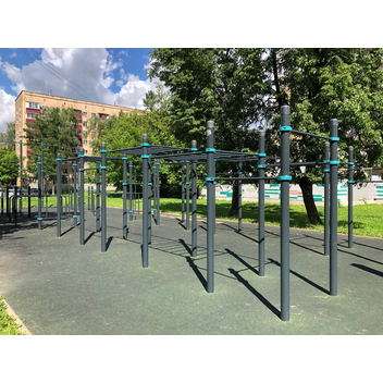 Комплекс состоит из двенадцати опорных столбов высотой 2600 мм, трех секций рукоходов и пяти перекладин для подтягиваний длиной 1200 мм. Элементы крепятся к опорным столбам при помощи хомутов. Высота фиксации перекладин для подтягиваний: 1 шт. – 2400 мм, 1 шт. – 2250 мм, 1 шт. – 2100 мм, 2 шт. – 1800 мм. Высота фиксации секций рукохода: 2 шт. - 2450 мм, 1 шт. - 2150 мм, Длина каждой секции 1900 мм. Шаг рукохода 310 мм. Длина комплекса не более 8400 мм.