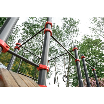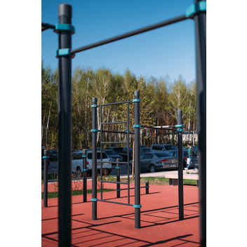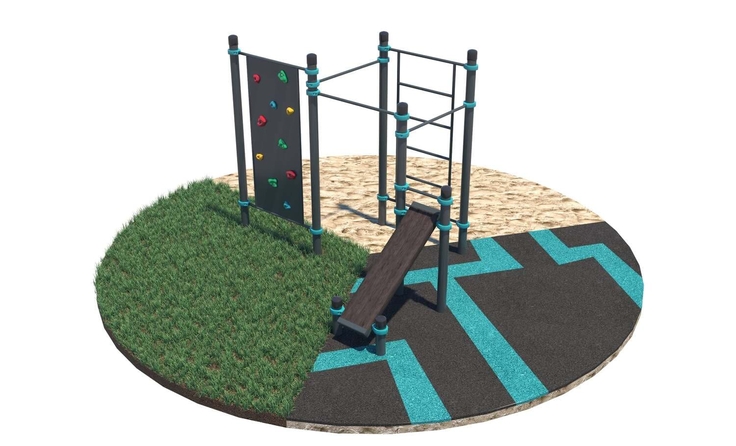 Комплекс состоит из восьми опорных столбов высотой: 4 шт. - 2600 мм, 1 шт. - 2300 мм, 1 шт. - 1500 мм, 2 шт. - 400 мм, трех перекладин для подтягиваний длиной 1200 мм, шведской стенки, наклонной скамьи и скалодрома. Элементы крепятся к опорным столбам при помощи хомутов. Шведская стенка крепится на высоте 2450 мм. Состоит из перекладин, расстояние между которыми 373 мм. Высота шведской стенки - 2073 мм, ширина - 1200 мм. Высота фиксации перекладин для подтягиваний: 1 шт. – 2300 мм, 1 шт. – 2150 мм, 1 шт. – 2000 мм. Наклонная скамья для упражнений на пресс крепится на высоте 1000 мм от поверхности основания в верхней части и на высоте 275 мм в нижней части. Перекладина для удержания руками крепится на высоте 1350 мм. Секция скалодрома крепится на высоте 2450 мм, высота скалодрома 2073 мм, ширина - 1200 мм. Длина комплекса не более 2900 мм.