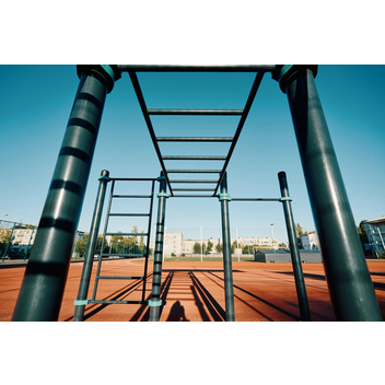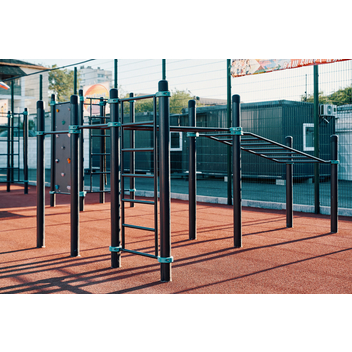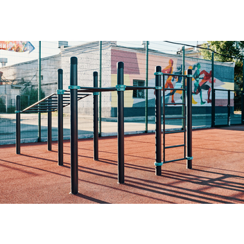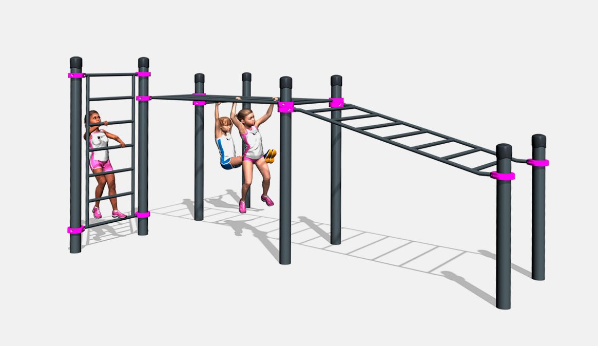 Комплекс состоит из турника, шведской стенки и двухсекционного рукохода — одна секция в подъём, вторая горизонтальная. По рукоходу можно ходить в обоих направлениях. Начинающим можно начать со спуска по наклонной секции рукохода. Так мышцы привыкнут к нагрузкам, тело запомнит движения. Постепенно можно перейти на горизонтальный рукоход, а потом добавить секцию в подъём.