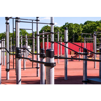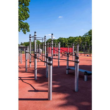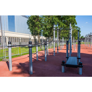 Опорные столбы увеличенного диаметра 108 мм и запатентованное соединение «хомут». Благодаря им площадка служит от 15 лет, выдерживает 9-кратные нагрузки и подходит для парасоревнований и размещения в реабилитационных центрах;