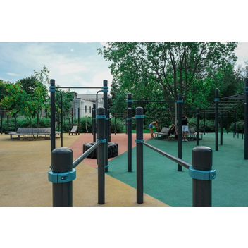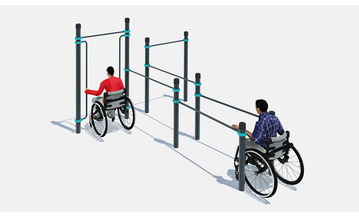 Комплекс состоит из восьми опорных столбов высотой: 2 шт. - 2600 мм., 2 шт. - 2000 мм., 2 шт. - 1500 мм, 2 шт. - 1200 мм, двух перекладин для подтягивания длиной 1200 мм, параллельных брусьев и брусьев разношироких. Элементы крепятся к опорным столбам при помощи хомутов. Высота фиксации перекладин для подтягиваний: 1 шт. - 2300 мм, 1 шт. - 1800 мм. Жерди параллельных брусьев крепятся на высоте 1300 мм, расстояние между центрами опорных столбов брусьев 608 мм. Жерди брусьев разношироких крепятся на высоте 1050 мм от поверхности основания, расстояние между центрами опорных столбов брусьев: 608 мм - с одной стороны и 808 мм - с другой стороны. Комплекс оснащен поручнями для инвалидов-колясочников. Длина комплекса не более 3910 мм.
