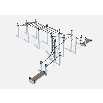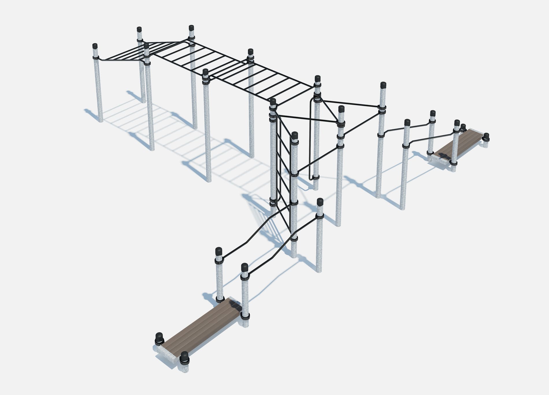 Комплекс состоит из двадцати одного опорного столба высотой: 9 шт. - 2600 мм., 3 шт. - 2000 мм., 1 шт. - 1500 мм., 4 шт. - 1200 мм., 4 шт. - 500 мм., пяти перекладин для подтягиваний длиной 1200 мм, трехсекционного рукохода (одна секция в подъем и две горизонтальных), шведской стенки, двух горизонтальных скамей, брусьев изогнутых разноуровневых и параллельных брусьев в подъем. Элементы крепятся к опорным столбам при помощи хомутов. Шведская стенка крепится на высоте 2450 мм. Высота шведской стенки - 2100 мм, ширина - 1200 мм. Высота фиксации горизонтальных секций рукохода: 1 шт. - 2400 мм и 1 шт. - 2300 мм. Длина каждой секции 1900 мм. Рукоход в подъем крепится к опорным столбам на высоте: 1700 мм - в нижней части и 2166 мм - в верхней части, длина рукохода 1770 мм. Горизонтальные скамьи креятся к опорным столбам на высоте 275 мм от поверхности основания.Комплекс оснащен поручнями для инвалидов-колясочников. Длина комплекса не более 9560 мм.