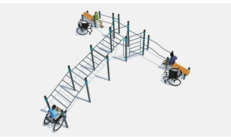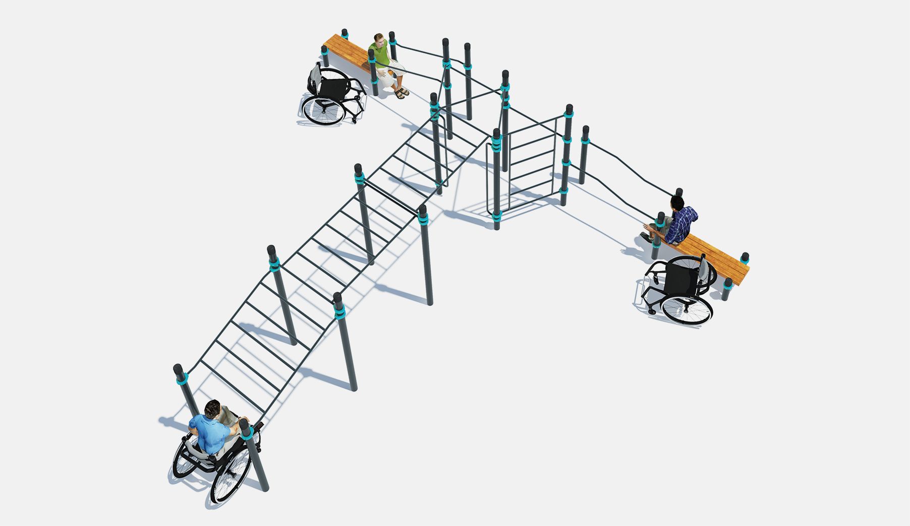 Рукоход в подъем, рукоход классический двухуровневый, вертикальные поручни для колясочников, 2 скамьи, брусья в подъем, брусья разноуровневые, шведская стенка