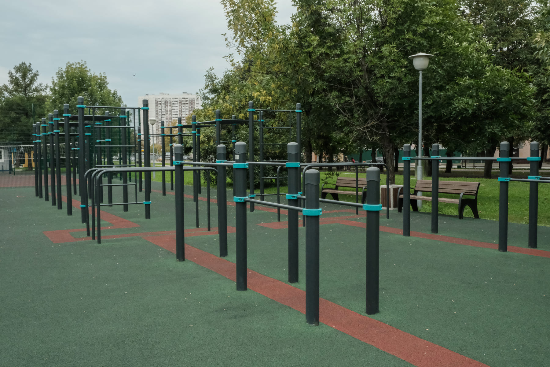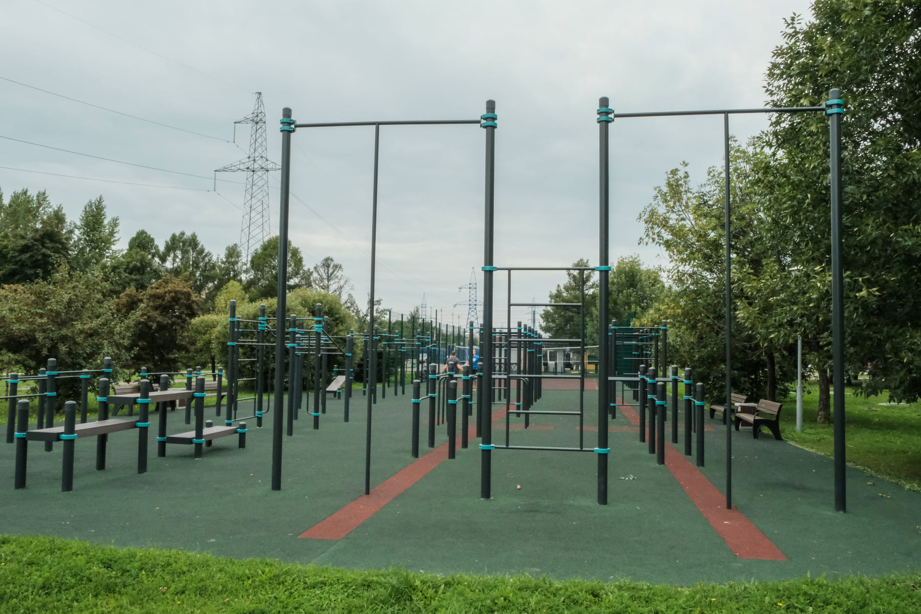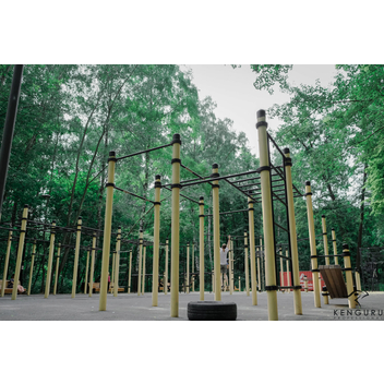 Площадка подходит для проведения соревнований. Например, прохождения на скорость полосы препятствий. Также на ней одновременно могут заниматься люди с разным уровнем физической подготовки, в том числе люди с инвалидностью. Есть оборудование для укрепления мышц спины и рук, на скамьях можно выполнять скручивания, а на шведской стенке — растяжку.